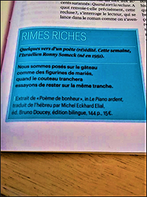 Ronny Someck is one of the 110 poets from all over the world who are in the anthology 'L'insurrection poétique'. Other poets are Ingrid Jonker, Breyten Breytenbach, Jack Hirschman, Max Jacob and many others.